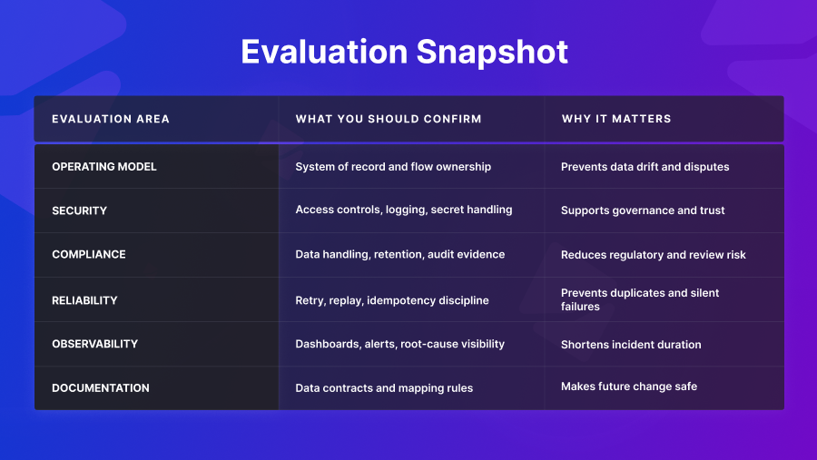 Buying integration is not just purchasing development hours. It is purchasing an operating model for data movement and process automation. A strong evaluation framework focuses on outcomes, governance, and long-term maintainability.
