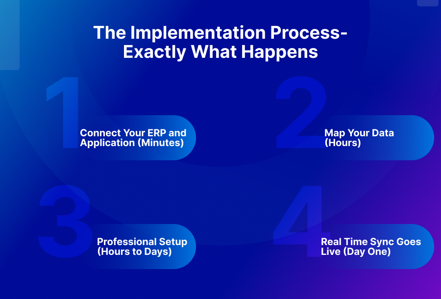 Standard single-store, single-ERP implementations go live within hours to days. The pre-built data flow mappings and professional setup eliminate the blank-canvas configuration that makes custom integrations take months. Most businesses are live and processing real transactions within 24-72 hours of beginning the data mapping step.