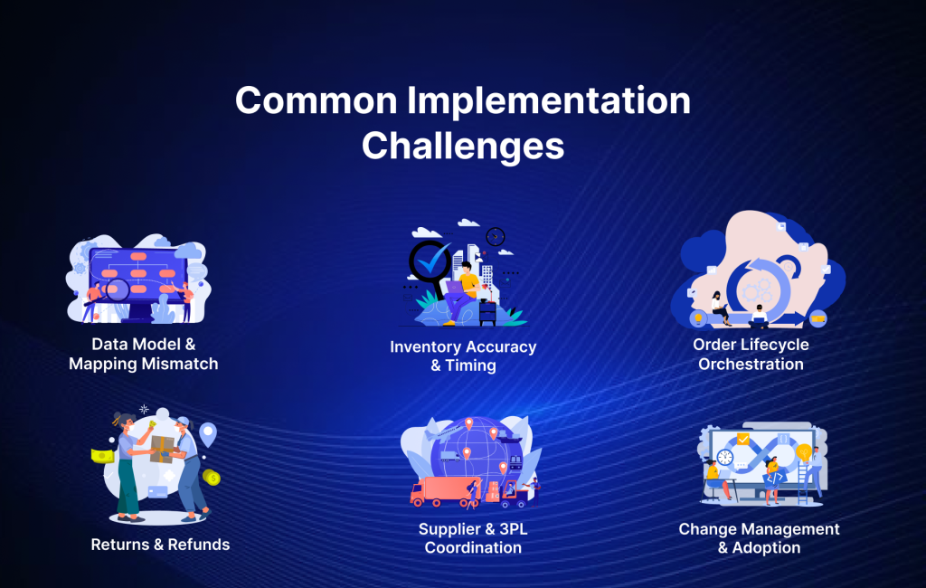Data mapping mismatches, timing gaps, order rule drift, messy returns, partner coordination issues, training difficulties, and governance gaps.