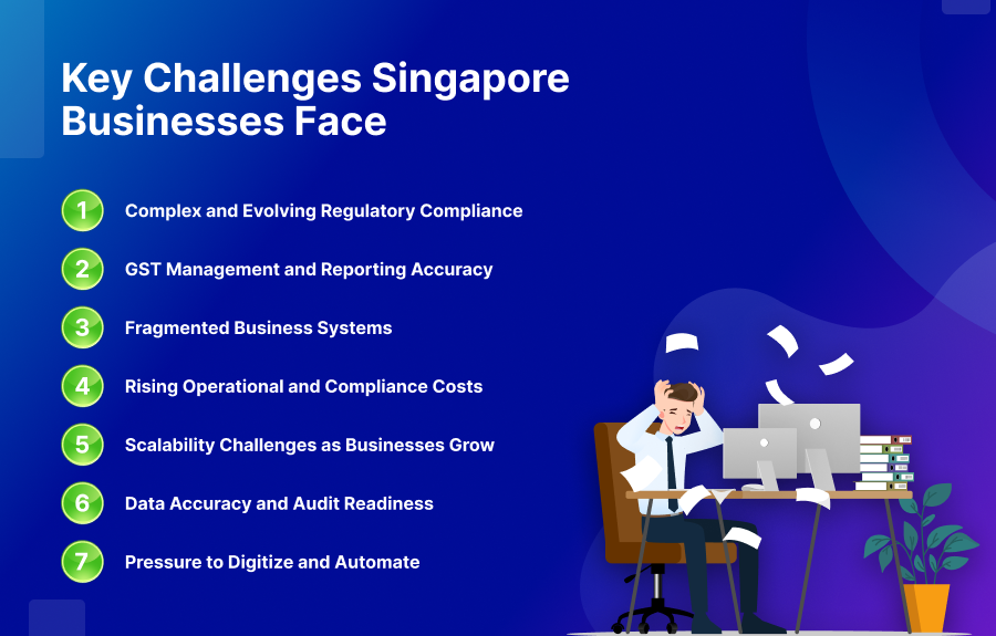 Singapore businesses must comply with strict regulatory frameworks set by authorities such as IRAS, ACRA, and PDPC. Requirements around GST filing, e-Invoicing readiness, data protection (PDPA), and financial reporting are continuously evolving. Keeping up with frequent regulatory updates while ensuring accurate, timely submissions is challenging, especially for businesses managing high transaction volumes or operating across multiple systems.