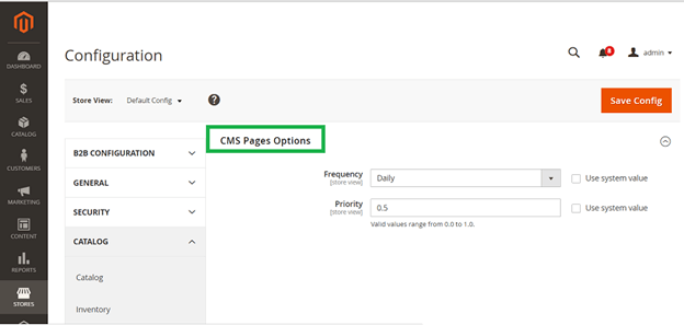 - Go to Stores >> Configuration >> Catalog >> XML Sitemap >>Open CMS Page options.