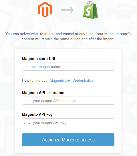 Click on the “Install App” button and the installation will be complete. You will be prompted to provide your Magento/Magento Go stores url, API Username and API Key for authorizing the App to use your Magento/Magento Go stores inbuilt API. Using those Magento/Magento Go API’s this App will migrate your data to your Shopify store.