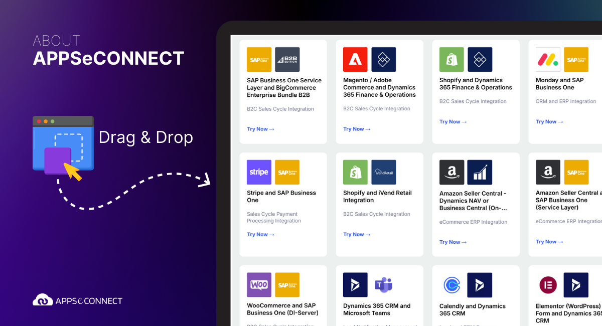 APPSeCONNECT is an enterprise-grade integration platform-as-a-service (iPaaS) designed specifically for complex scenarios like Salesforce ERP integration and Salesforce SAP Business One middleware. With pre-built connectors, drag-and-drop mapping, and built-in error monitoring, your project timeline can be accelerated and your reliance on custom code reduced.