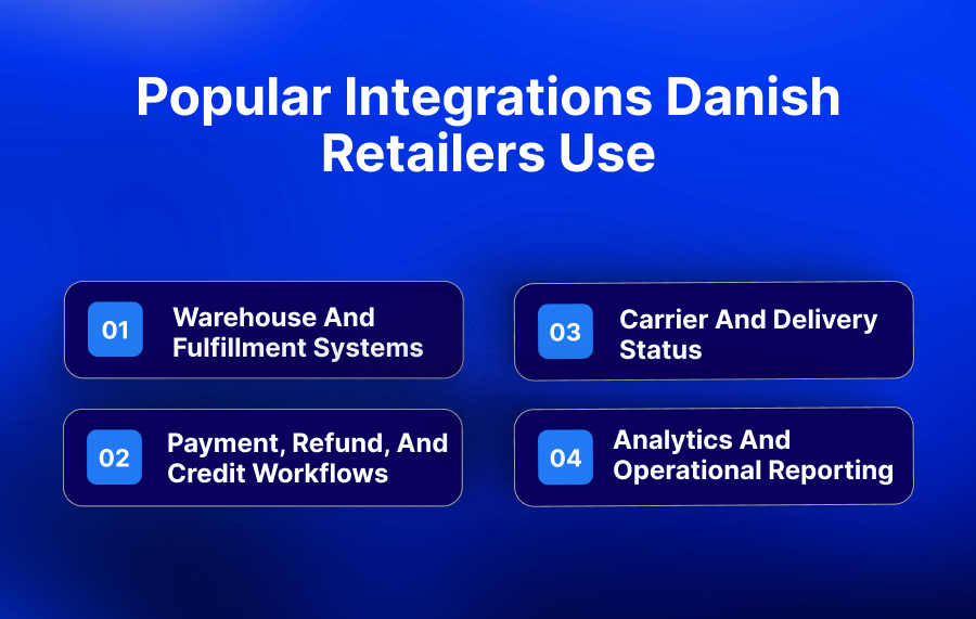 Danish e-commerce ERP solutions typically connect more than two systems. Retailers integrate storefront, ERP, warehouse execution, carriers, payments, and analytics, because order tracking depends on the whole chain. The goal is not to connect everything at once. The goal is to connect the flows that remove customer-facing uncertainty and remove manual effort.